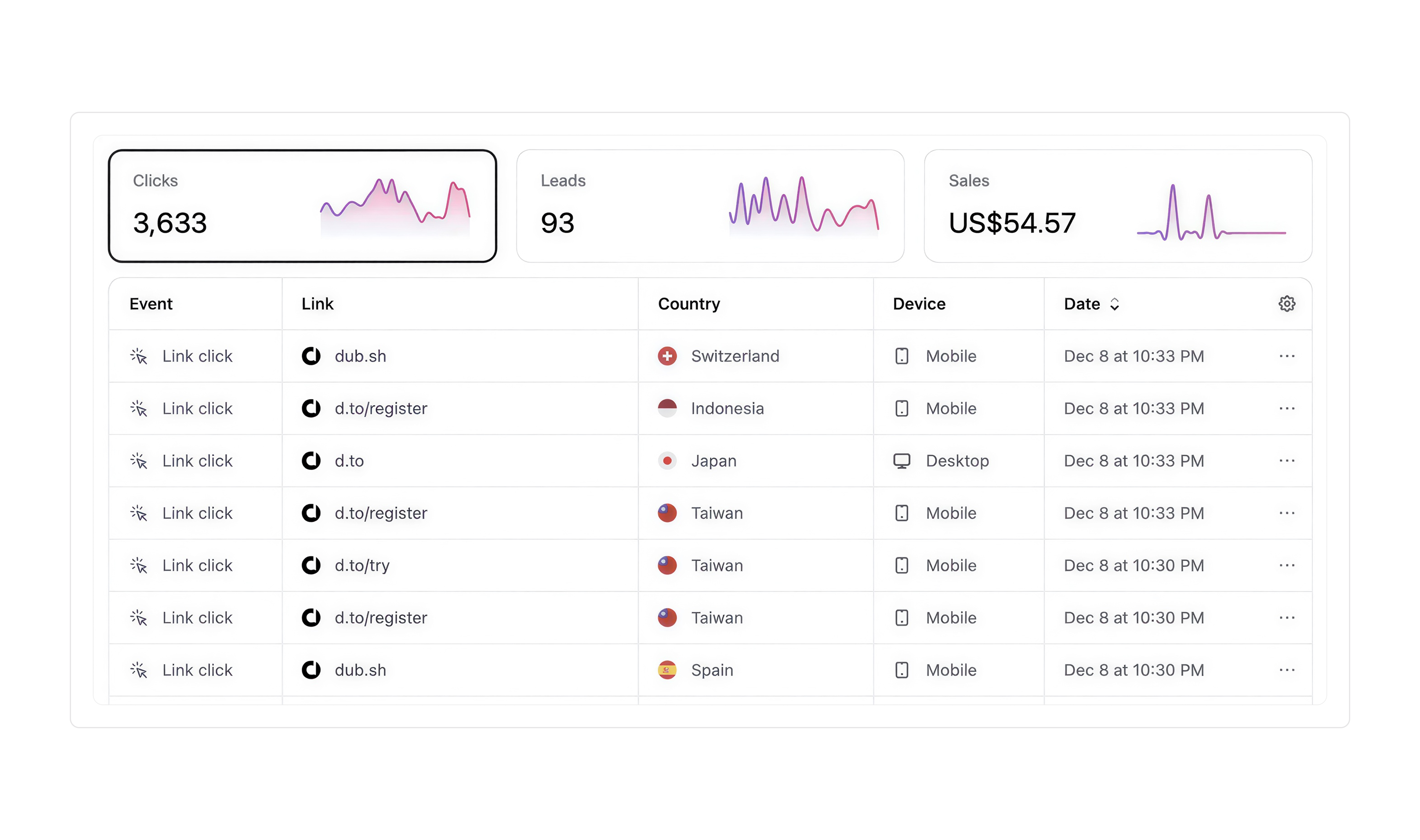 Clean dashboard. Real analytics. QR codes. No docs, no setup, no drama.